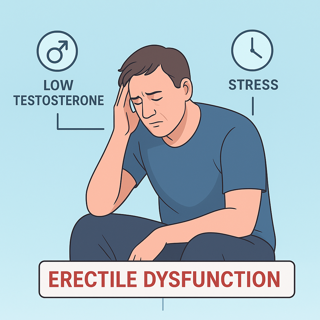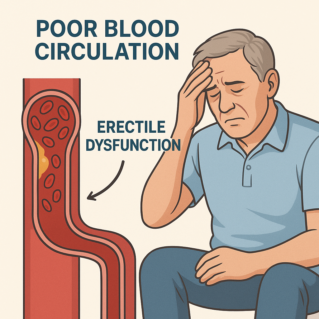 ED mostly occurs due to poor blood circulation, diabetes, stress, high blood pressure, obesity, and hormonal imbalance. Smoking, alcohol, and aging further weaken nerves and reduce testosterone. Medications for heart or diabetes can also worsen performance. Together, these factors make it difficult to achieve and maintain a firm erection.